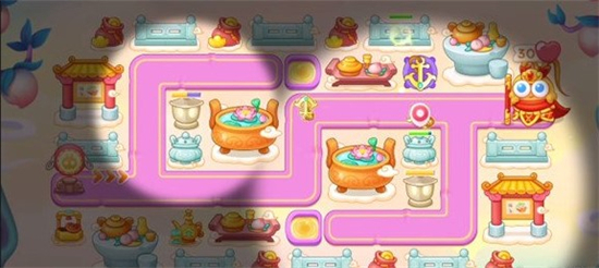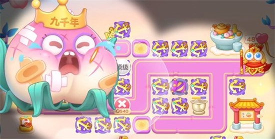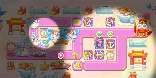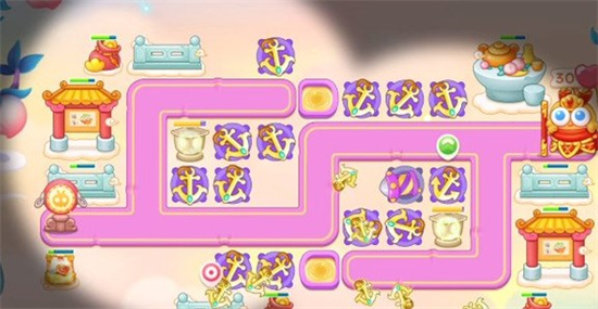 第三波将左边的祈天灯耐久度打高后,建造船锚,尽量将前半段地图的主要位置的道具拆除,建上炮塔,这一波建议大家将两个祈天灯的耐久度打到最高,以免打桃子的时候来不及打。