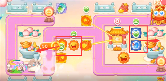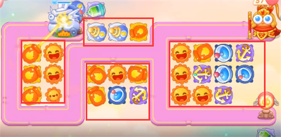 3、然后向图中顺序开图,有怪过来之后锁定右侧其它道具让右侧的太阳开图。