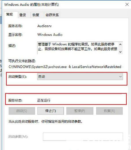 3、Windows Audio 的属性(本地计算机)窗口,将该服务的启动类型设置为自动,服务没有开启的话,还要开启;