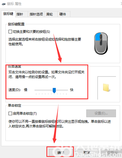 4、随后找到“双击速度”,将双击速度调整至中间位置,正常速度点击确定即可。