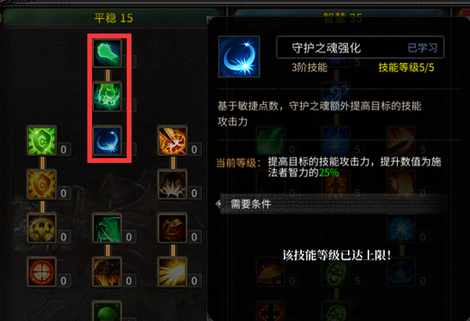 (2)天赋加点推荐:敏魔法天赋需要优先点数“平稳”板块中百分比提升敏捷的天赋,其中守护之魂强化还可以根据属性百分比提高技能攻击力,最大限度的获取敏魔法加点的收益。后续跟全智法一样,加“智慧”板块的天赋,点出刷怪最强天赋——“幽魂熟练”。