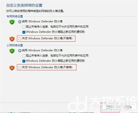 4、进入自定义设置界面,勾选专用网络设置和公用网络设置关闭Windows Defender防火墙选项点击确定按钮即可。