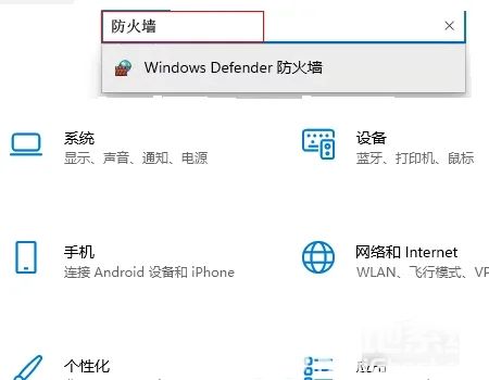 2、进入Windows设置界面,通过搜索框搜索防火墙点击进入。