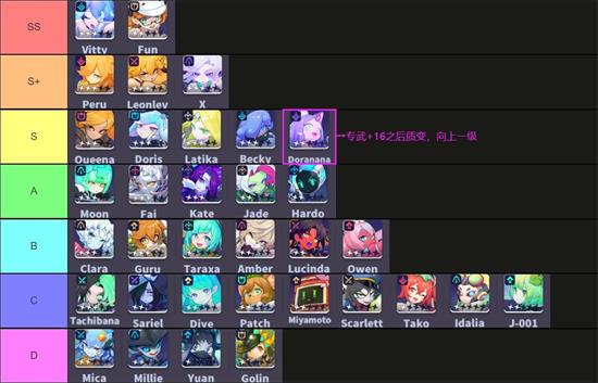 奈奈专16前和专16后基本上属于两个角色。推荐大家开服优先把她的专武升到+16,才能解锁她的完全体——也就是开局满充,可以直接放大招。奈奈的核心就是她的大招召唤的噜噜——一只大猫。这个大猫可以继承奈奈的全部属性,战斗力非常夸张,并且能造成群体击飞(专16后出场时)以及单体击飞(被动),还能瞬移到对面后排(被动)。召唤出来之后基本上等于场上多了个又肉又能抗的重装战士。利用好卡位等摆放角色技巧,可以把大猫用来当前排扛伤,也可以用来当刺客单切对面的c位。而且奈奈本身属于暗系角色,很方便补羁绊。