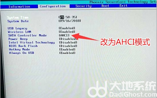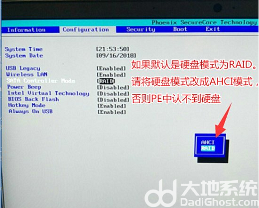 6、注意:再返回configuration这项,查看sata controller mode这项,如果默认硬盘模式为RAID,请将硬盘模式改为AHCI模式,否则进PE后不能认出硬盘,如果更改后记得按F10保存;