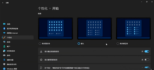 在安装22H2更新后,打开系统设置,左侧选择“个性化”,右侧选择“开始”,这里会多出一个叫做“布局”的选项。