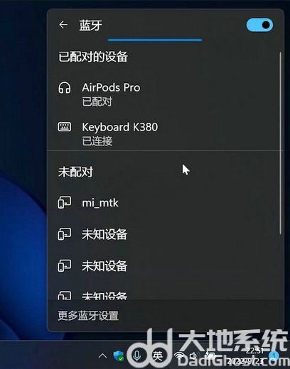 更新22H2后,任务栏右侧的“快速设置”界面里,蓝牙也可以像WiFi一样直接进行配对等操作了,而无需进入系统设置。
