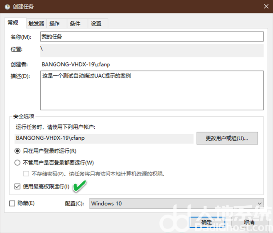 1、在任务栏图标输入框中,键入任务调度器以运行任务调度器。在任务调度器对话框中,实现“实际操作→创建日常任务”菜单栏指令。填写下面的日常任务名称,确保选中“具有最大权限的应用程序”复选框,并从“设备”目录中选择“Windows10”。