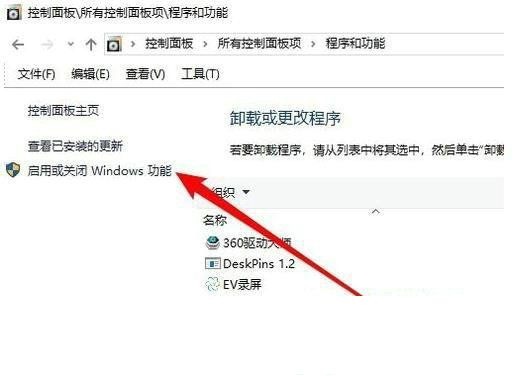 3、这时就会弹出“程序和功能”窗口,点击窗口左侧边栏的“启有或关闭Windows功能”菜单项;