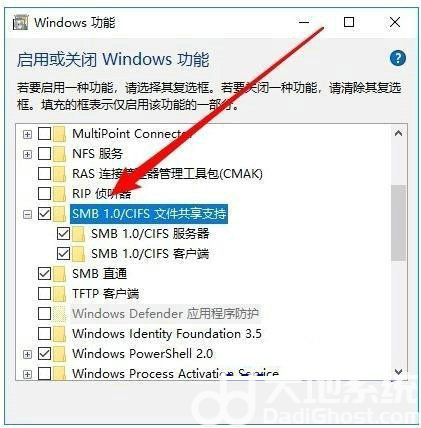 4、这时就会打开Windows功能窗口,在窗口中我们勾选“SMB 1.0/CIFS文件共享支持”前面的复选框,然后把其下面所有的勾选全部选中。