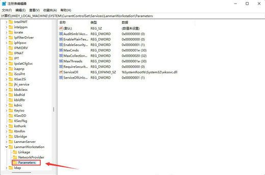 3、接下来定位到HKEY_LOCAL_MACHINE\SYSTEM\CurrentControlSet\Services\LanmanWorkstation\Parameters注册表项;