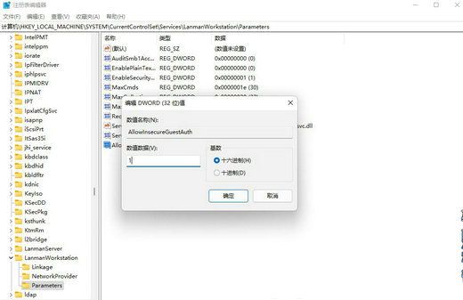 4、然后在右侧新建一个Dword32位值的注册表键值AllowInsecureGuestAuth,把其数值数据修改为1,最后点击确定按钮,重新启动计算机即可。