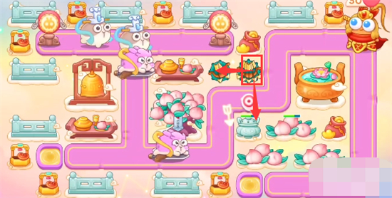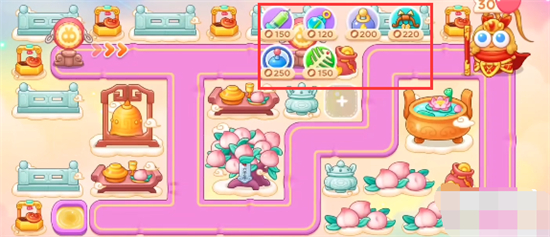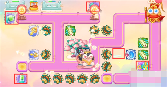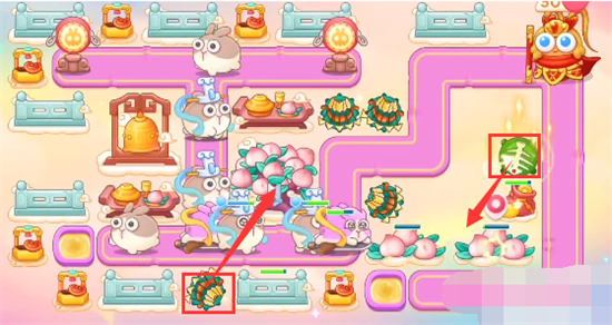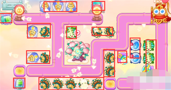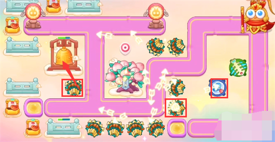 6、放置炮塔位置如图所示:蟠桃树附近放置多重箭好开图,出口放置毒针,拐角放置泡泡塔。
