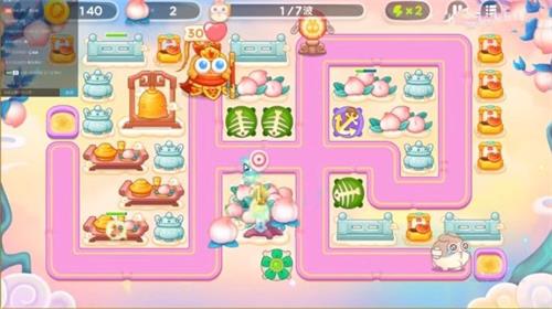 3.第二波打三个桃子障碍,买风扇升三级,左边粉兔锁定打,打完鱼刺升三,打围栏再打大钟。