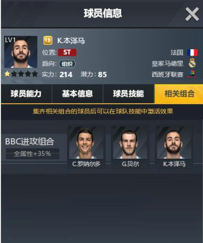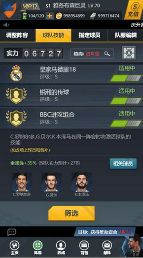 球队技能即为搭配阵容的核心,玩家可以根据自己想激活的技能进行球员的选择。球队技能最多能激活3个,一般情况下搭配一套同俱乐部的阵容,效果最好,球队实力最高。因为球队技能有同俱乐部球员上场的属性全体加成,加成属性很高,同俱乐部的指定几个球员上场也会有属性加成。根据自己现有的球员,要在有限的几个球队技能里选择哪几个是自己最想激活的技能,是最考验玩家的,这也是本游戏比较有策略的地方。