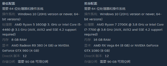 处理器:AMD Ryzen 7 2700X @ 3.8 GHz or Intel Core i7-7700 @ 3.6 GHz (AVX, AVX2 and SSE 4.2 support required)