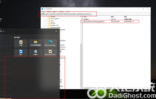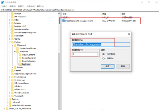 4、再在新建的“Explorer”项中新建一个“DWORD (32)值”,命名为:DisableSearchBoxSuggestions,数值设置为“1”。注意: 0 为(开启)。