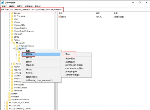 2、定位到:计算机\HKEY_CURRENT_USER\Software\Policies\Microsoft\Windows