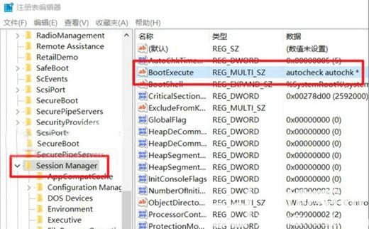 7、在SessionManager文件夹中找到BootExecute并双击打开。