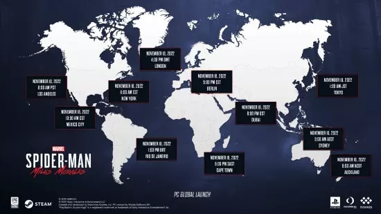 今日(11月17日),《漫威蜘蛛侠:迈尔斯》官方公布了本作PC版游戏的全球上线时间图,目前本作已开启预载,游戏将于北京时间11月19日0点解锁。
