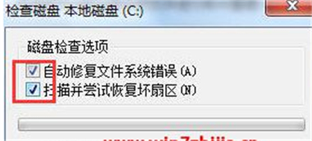 3、弹出磁盘检查窗口,勾选“自动修复文件系统错误”和“扫描并尝试修复坏扇区”,点击“开始”;