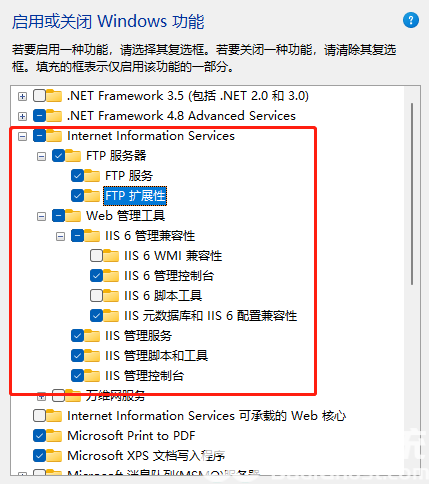 在弹窗中找到 Internet信息服务,并打开勾选以下配置 点击确定