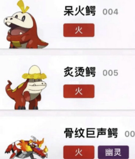 进化形态:呆火鳄——炙烫鳄——骨纹巨声鳄,最终属性:火+幽灵。