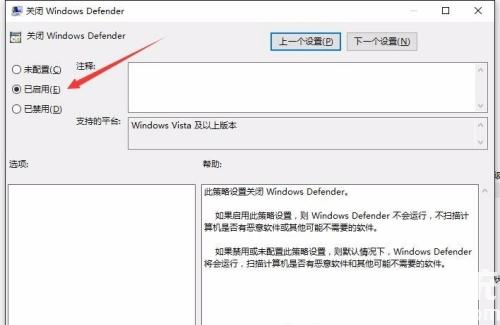 4、这时双击打开关闭Windows Defender,选择“已启用”点击确定。