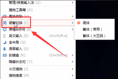 1、切换出搜狗输入法,鼠标右键点击输入法选择“简繁切换”,接着点击右侧“简体”即可切换成简体