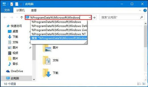 1、打开“此电脑”,在地址栏中输入:%ProgramData%MicrosoftWindows 并按下回车键;
