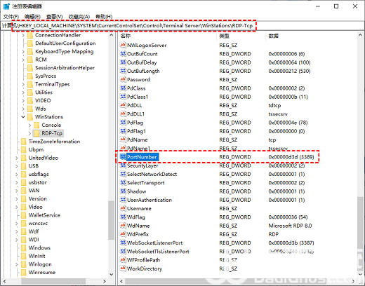 步骤2. 导航到“HKEY_LOCAL_MACHINE\System\CurrentControlSet\Control\Terminal Server\WinStations\RDP-Tcp”,向下滚动并找到“PortNumber”并双击打开它。