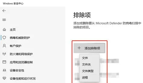 5、排除项窗口中,找到并点击【添加排除项】,并根据实际情况选择需排除项的具体类型,找到需排除项的具体位置,并点击【选择文件夹】即可(这里以文件夹类型为例)