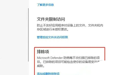 4、‘病毒和威胁防护设置”窗口中,找到并点击【排除项】,这里就是白名单的设置位置,排除项说明:Microsoft Defender 防病毒不会扫描已排除的项目。已排除的项目可能包含使你的设备易受攻击的威胁