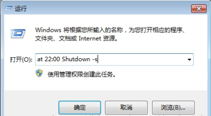 2、输入“at 22:00 Shutdown -s”命令( at是一个设置任务的命令,配合shutdown命令也可以实现自动关机),点击确定后运行命令。