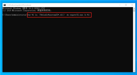 2、在弹出的管理员页面中输入“for %1 in (%windir%\system32\*.dll) do regsvr32.exe /s %1 ”,并按回车确认。