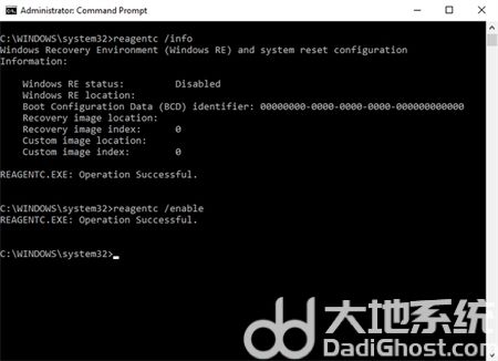 3、如果提示恢复环境已禁用(Disabled)的话,则需要输入reagentc /enable命令并按Enter键执行,即可重新启用恢复环境。