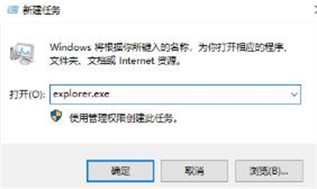 4、在“新建任务”界面打开框中输入:explorer.exe,点击确定即可。