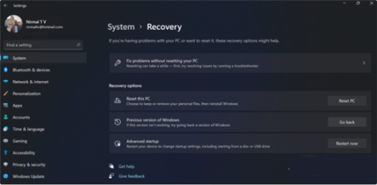 2.在系统设置下,选择“恢复”选项,您将能够看到“以前版本的窗口”选项,您还可以在它旁边看到一个“返回”按钮,单击此按钮。