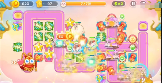 1、开局直接暂停,建一个三级的鱼骨,锁定桃子,再建一个鱼骨锁定香炉,然后再建一个二级烟花,锁定钱袋。