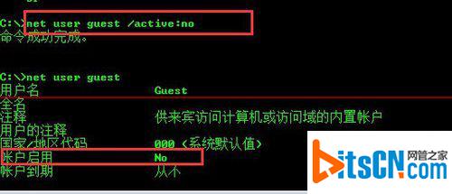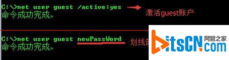 6、输入 net user guest /active:yes 激活guest账户,改密码的话就是net user guest 新密码
