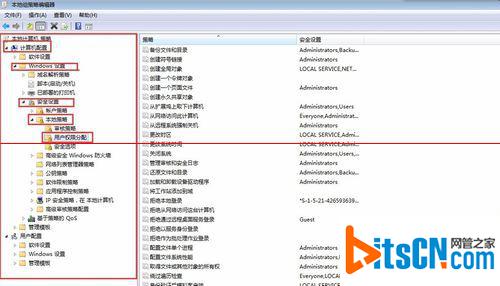 8、依次打开“计算机配置-windows设置-安全设置-本地策略-用户权限分配”把窗体打开到如下图所示状态