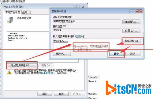 10、找到允许本地登录,把guest添加进去,要注意,是可以手动输入guest,但是一定要点一下“检查名称”,形成完整的名称才行。