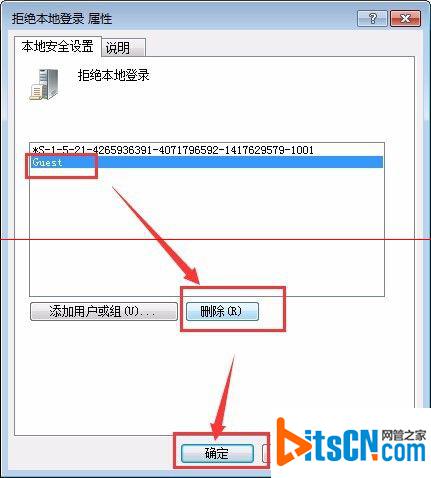 9、分别找到这几项“拒绝本地登录”和“允许本地登录”,把拒绝的guest项删除,如图