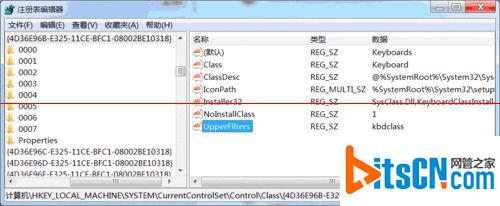 8、打开注册表:HKEY_LOCAL_MACHINESYSTEMCurrentControlSetControlClass{4D36E96B-E325-11CE-BFC1-08002BE10318},新增"UpperFilters" 值为"kbdclass"。