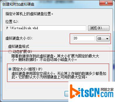 5、确定后根据自己的需求填入想要的大小。格式也根据自己需求决定。我们这里大小填入20GB,选择固定大小的方式,确定后,系统便会开始创建一个新的磁盘。