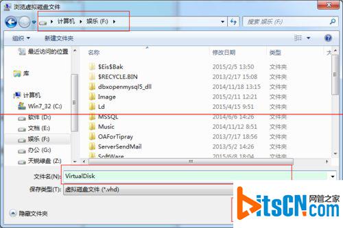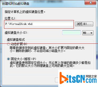 4、选择自己希望存放的VHD的路径。我们这里选择F盘,名称为VirtualDisk