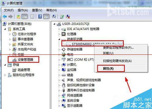 3、在其中展开“磁盘驱动器”,在其下找到并右键本机所使用的硬盘选择“属性”;