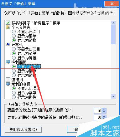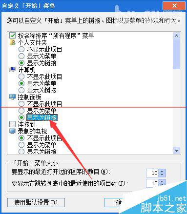5、找到控制面板,发现是被设置为不显示了。点选显示为“链接”,并确定。
