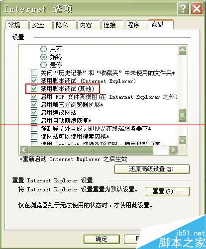 5、返回“Internet选项”窗口,切换到“高级”选项卡;在“浏览”栏中将“禁用脚本调试(Internet Explorer)”和“禁用脚本调试(其他)”的复选框去掉勾选。