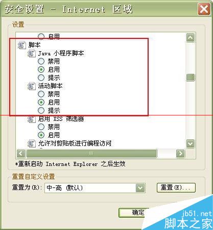 4、选中“禁用”单选按钮,在“活动脚本”栏中选中“禁用”单选按钮,单击“确定”;